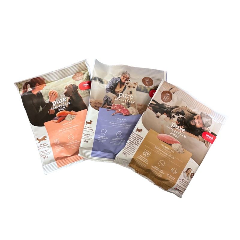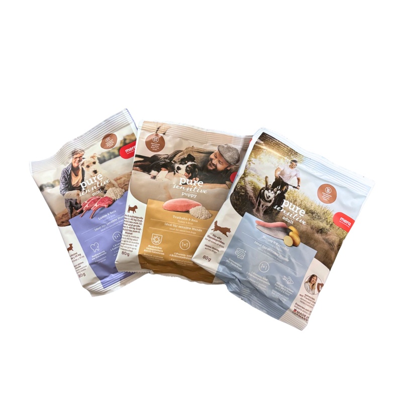 Neznáte ještě krmivo MERA? Nyní můžete od nás získat na vyzkoušení pouze za cenu poštovného sadu 3 vzorečků skvělých krmiv MERA pure sensitive pro citlivé psy.
